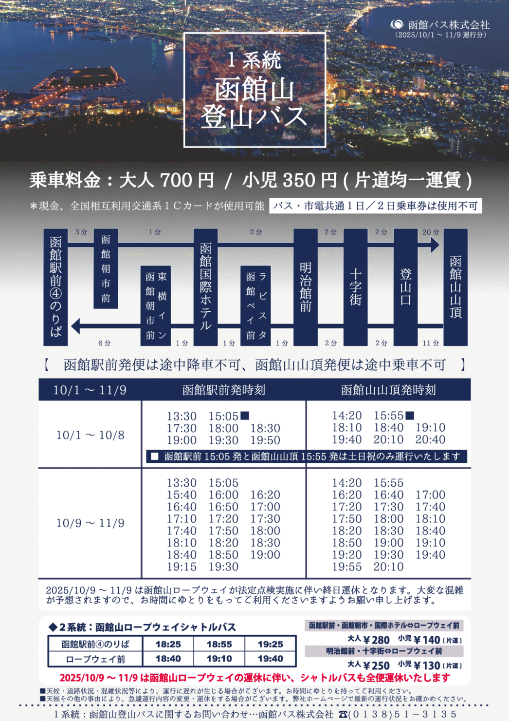 ※函館山ロープウェイ運休時は、このシャトルバスも運休になります。