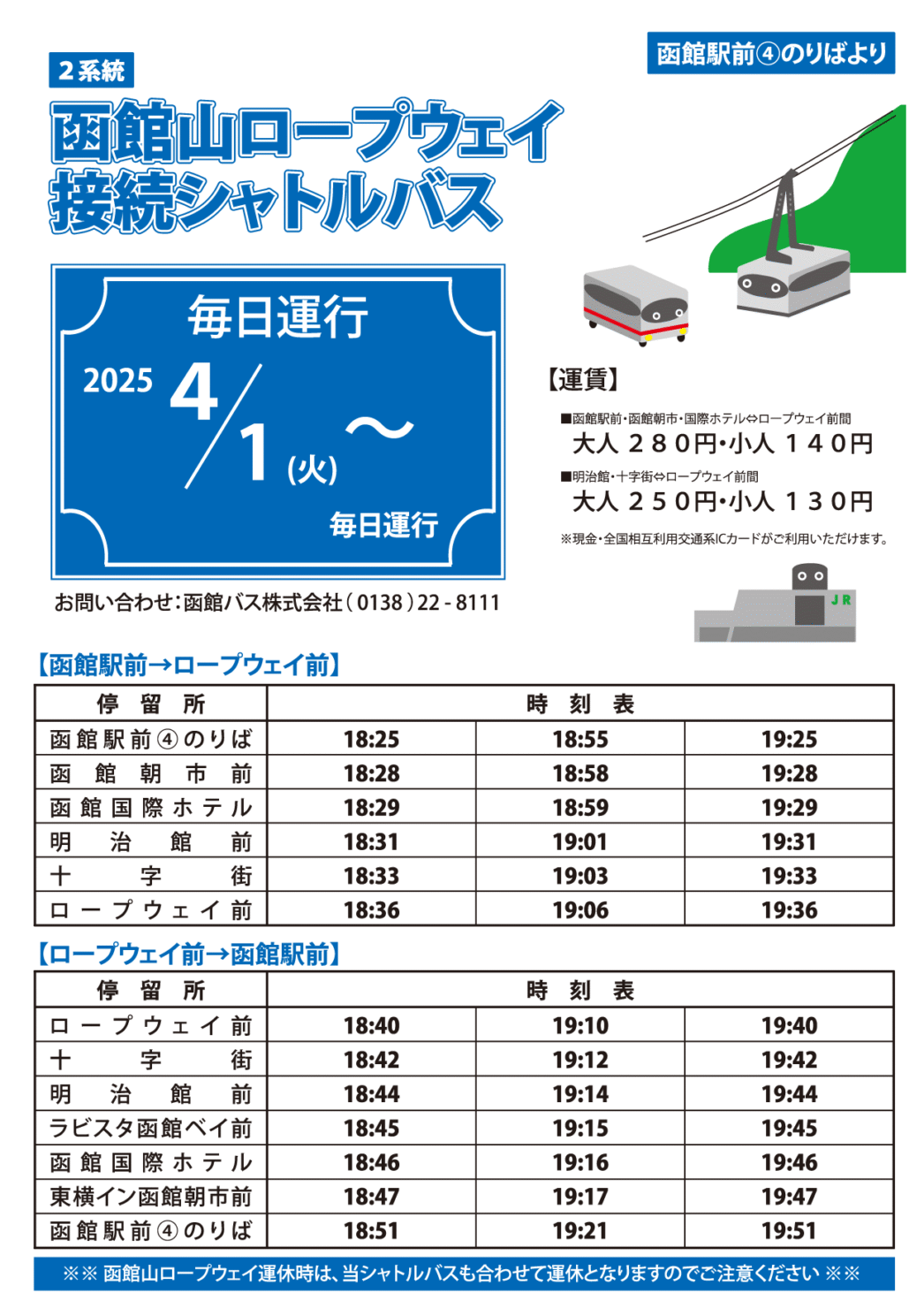 通年 | A系統 [函館駅前⇒ロープウェイ前] ※始発時刻および主な停留所のみ記載 ▼函館駅前 発 9:17(最終17:10) ▲ロープウェイ前 着 9:36 B系統 [ロープウェイ前⇒函館駅前] ※始発時刻および主な停留所のみ記載 ▼ロープウェイ前 発 9:40(最終22:15) ▲熱帯植物園前 着 9:51 |