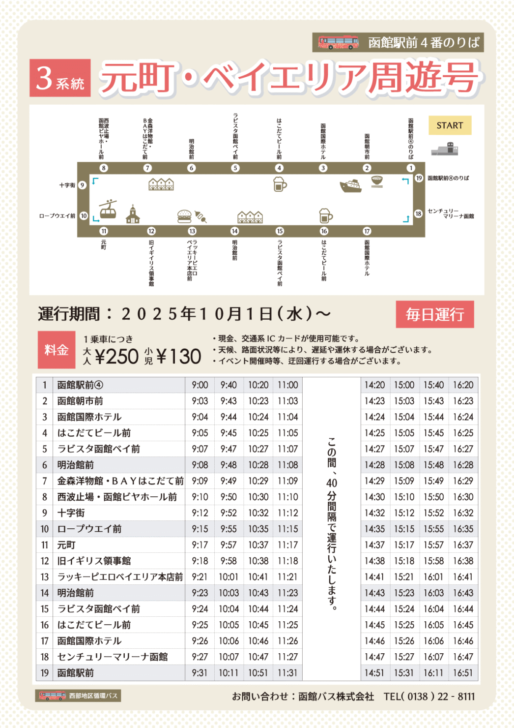 2025年4月1日~ | ▼函館駅前4番のりば 発 9:00から40分間隔、最終17:40 ▼明治館前 発 9:08から40分間隔、最終17:48 ▼ロープウェイ前 発 9:15から40分間隔、最終17:55 ▼明治館前 発 9:23から40分間隔、最終18:05 ▲函館駅前4番のりば 着 9:33から40分間隔、最終18:13 |
