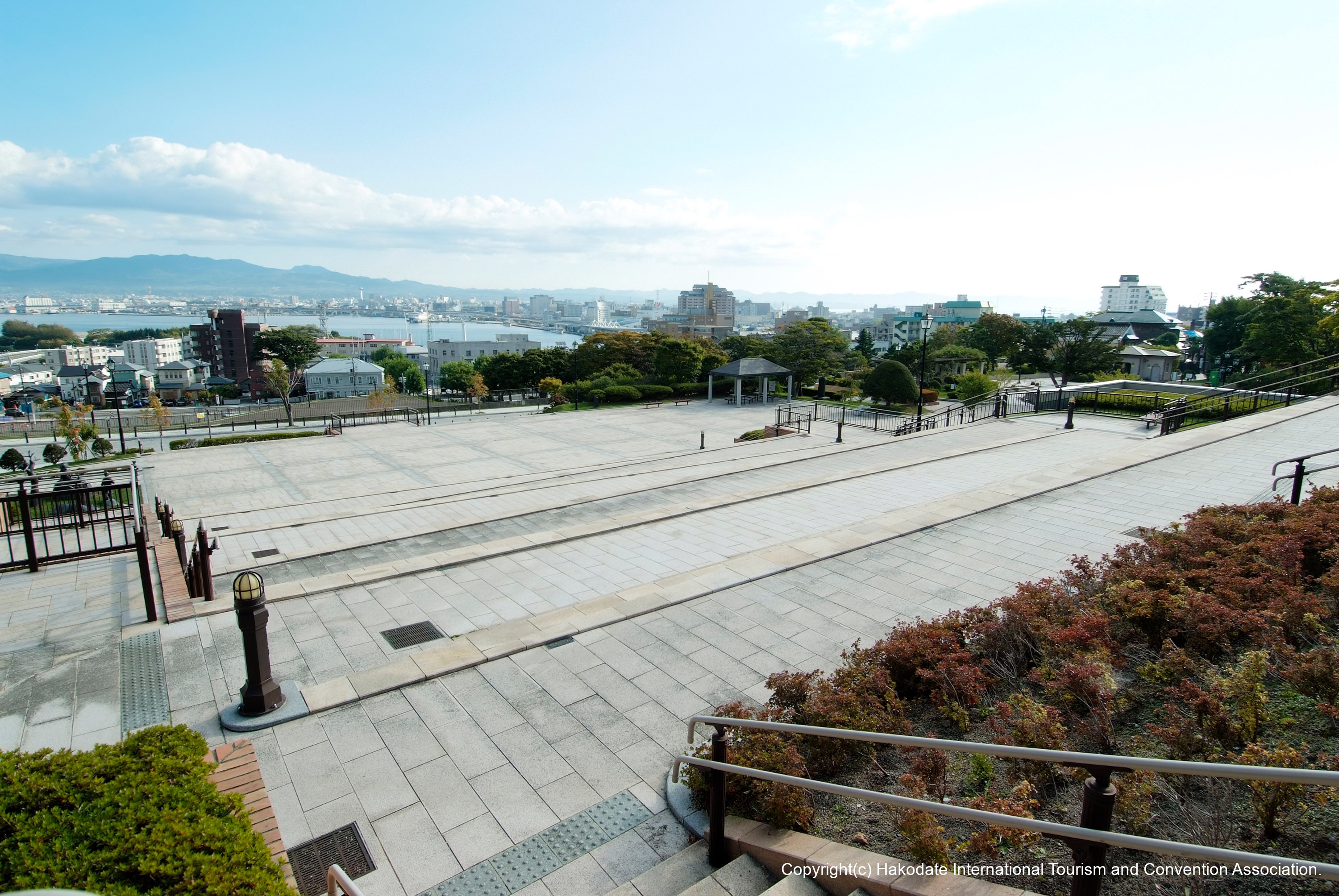 かつて道南行政の中心地として位置し、園内には北海道指定有形文化財の旧北海道庁函館支庁庁舎、旧開拓使函館支庁書籍庫が現存し、すぐ近くには重要文化財旧函館区公会堂や旧イギリス領事館があり、函館の歴史を色濃く残す公園です。高台からは函館港と市街が一望でき、ビュースポットにもなっています。