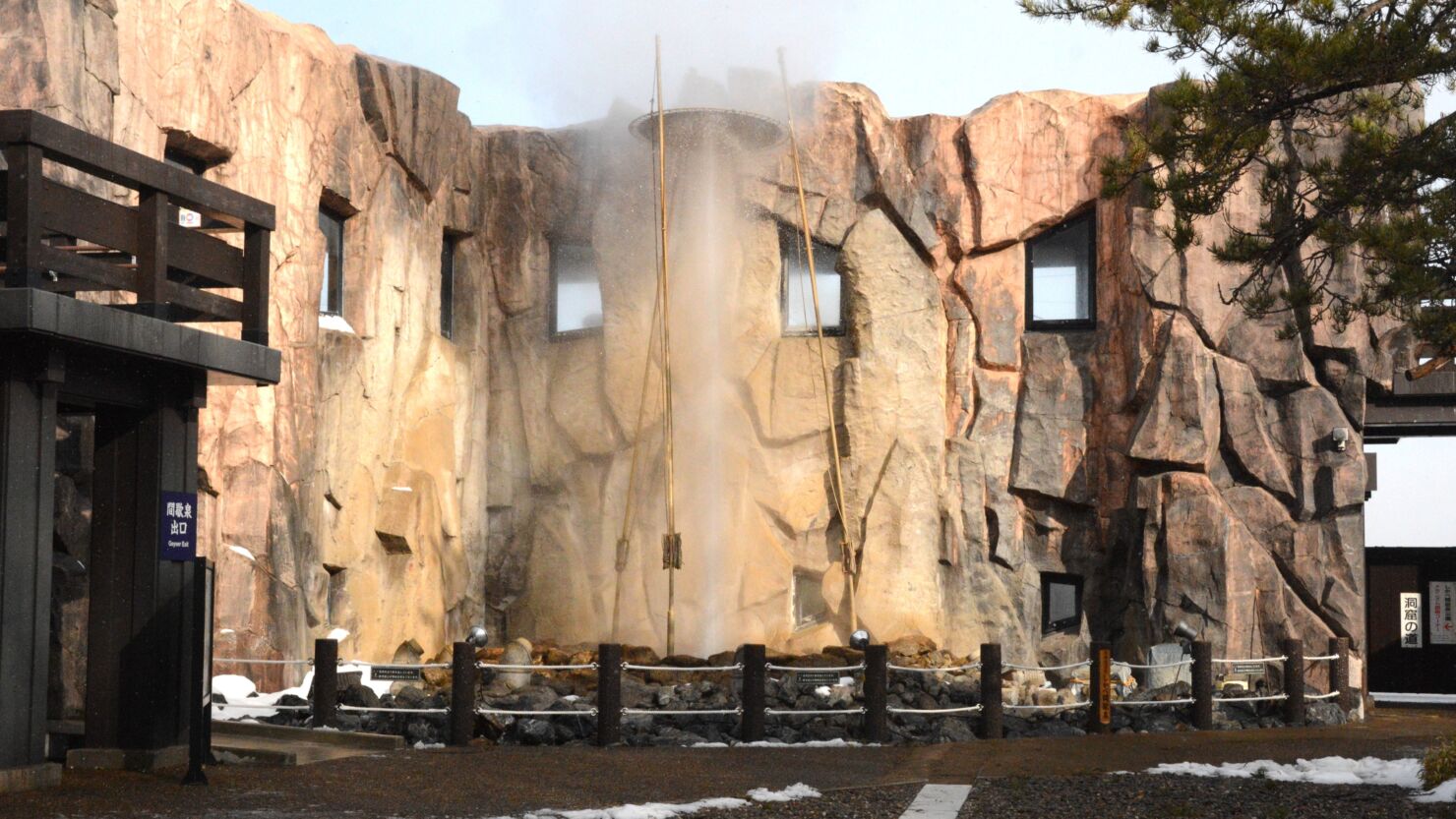 スノーシュー体験を楽しんだ後は、旅の後半に向けて、足湯と温泉蒸し釜料理を堪能し、冷えた体を温めましょう♪訪れたのは、鹿部町「道の駅・しかべ間歇泉公園」。なんといっても見どころは、103度の高温の温泉が高さ約15mまで噴きあがる大迫力の間歇泉。国内でも珍しい天然の間歇泉で、10分から15分間隔(目安)で見ることができます。足湯処は間歇泉のすぐ向かいに設置されており、噴きあがる様子を楽しみながらゆっくりと足湯に浸かることができます。