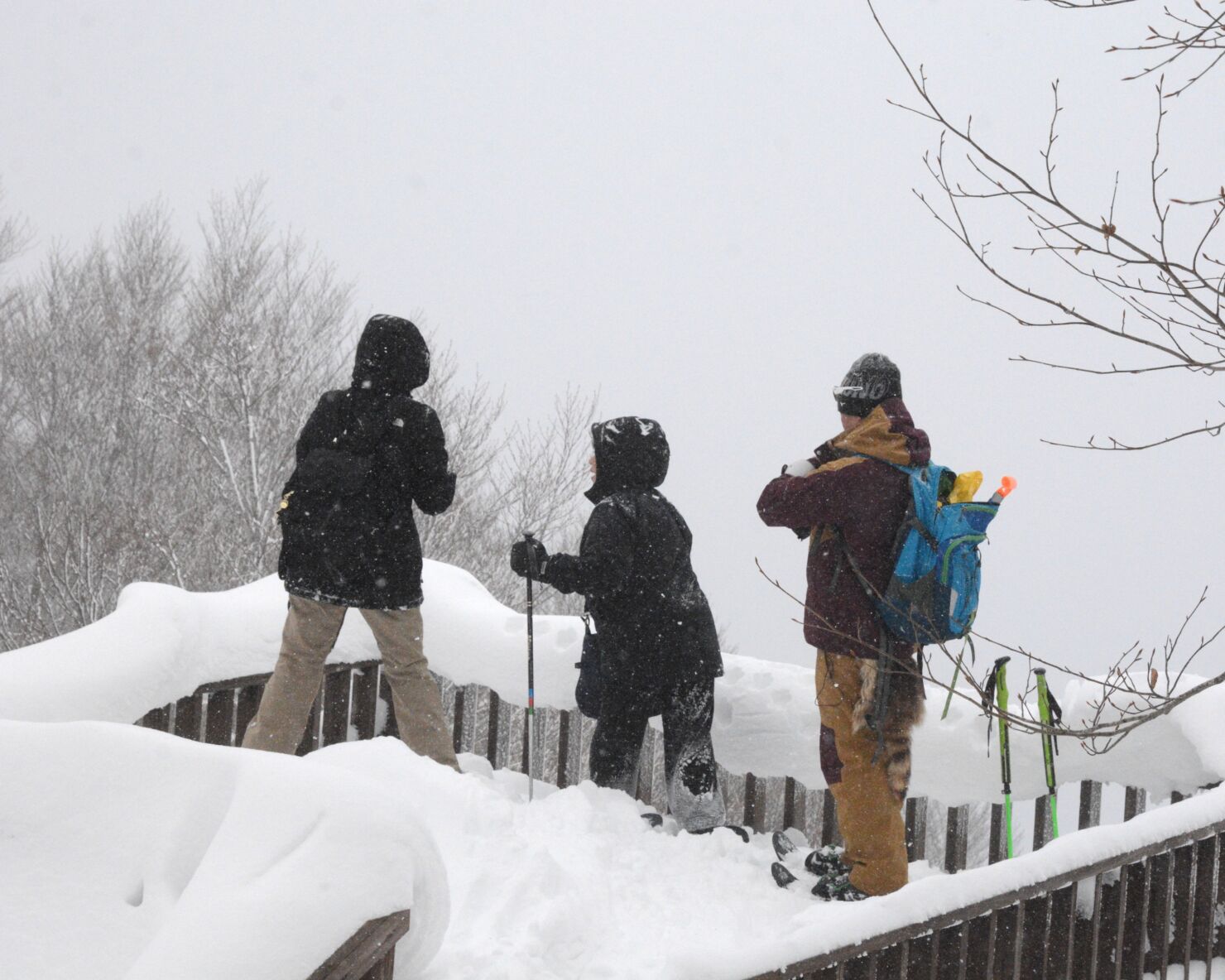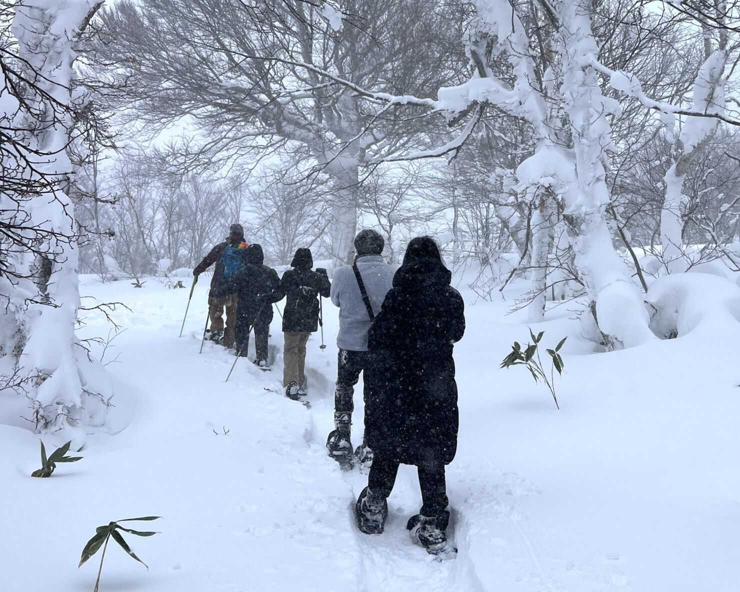 山頂へ到着したらいよいよスノーシュー体験スタートです!山頂エリア周辺の山道を散策していきます。あたり一面に広がるのは、真っ白な雪景色。雪の結晶が光を反射し、きらきらと輝いている神秘的な様子はまさに”白銀の世界”です!降雪のある日には柔らかな新雪が降り積もり、思わず飛び込みたくなります。雪の世界をスノーシューで歩きながらゆっくりと堪能しましょう♪