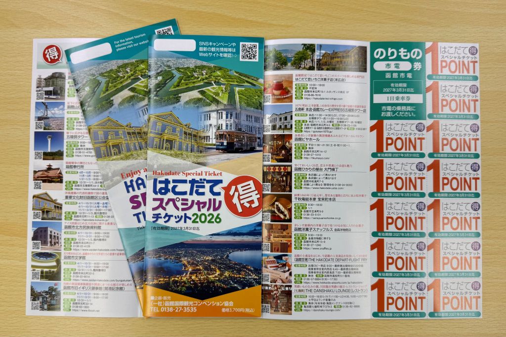 「のりもの券」(市電1日乗車券へ交換可)と観光施設や飲食店、土産品店で利用可能な12枚の「ポイント券」がセットになったお得なチケットです(1冊3,700円(税込))。1冊函館観光の際には是非「はこだてスペシャルチケット2026」をご利用ください!本サイトで事前の予約購入もできます。詳細は下記をご確認ください。