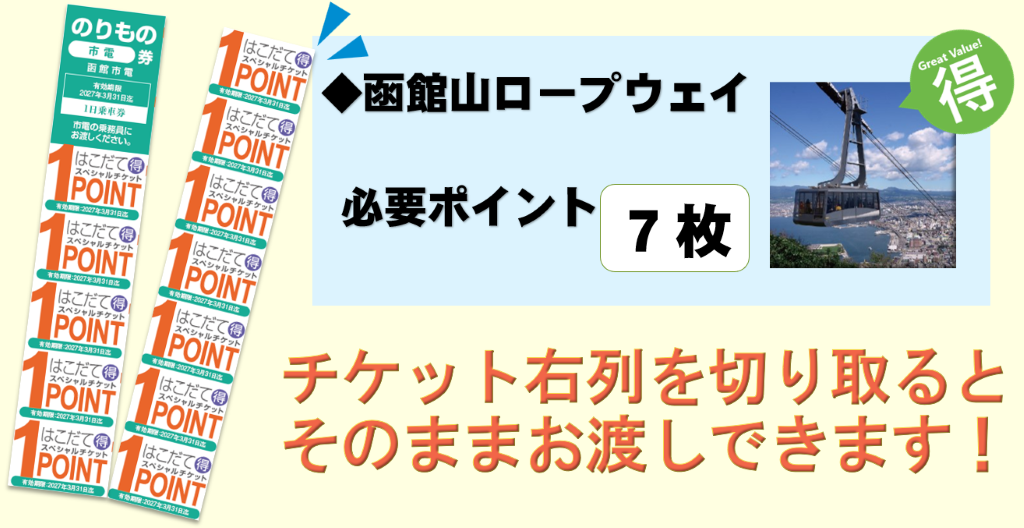 ポイント券を7枚使って函館山ロープウェイを利用します。ポイント券はミシン目で切り取りできるようになっているのでスタッフの方へお渡しください。