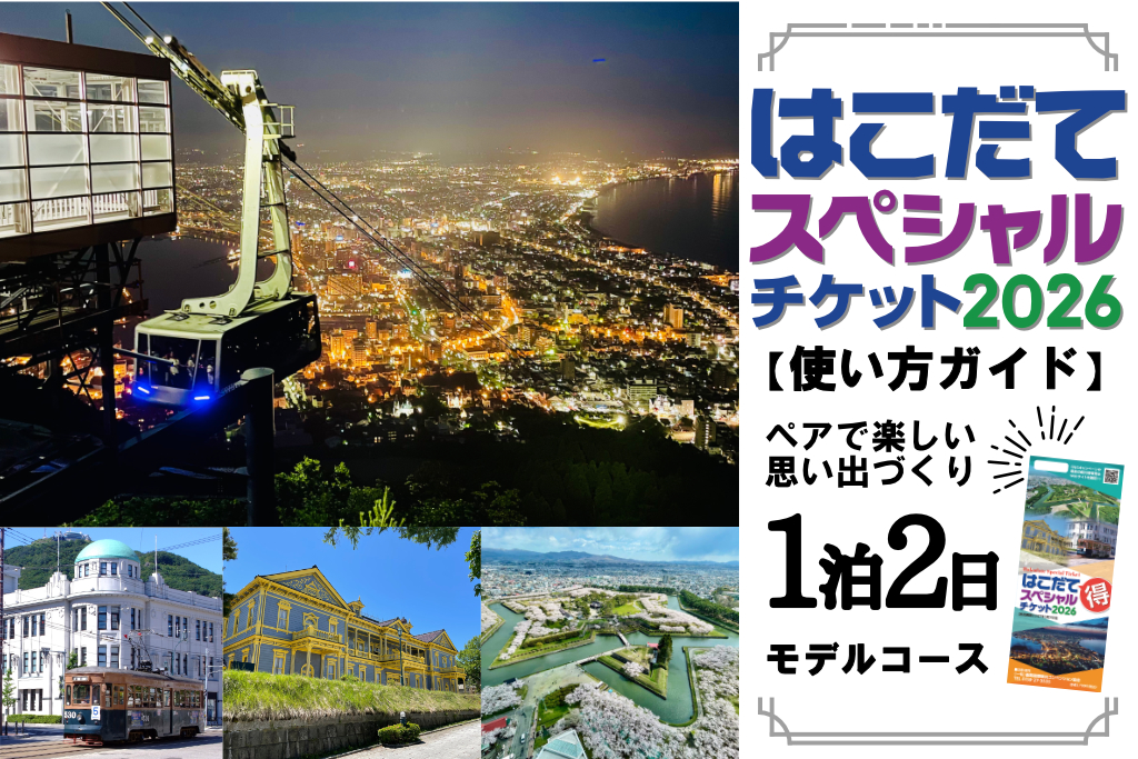 「のりもの券」と12枚の「ポイント券」でお得に函館エリア観光ができる、はこだてスペシャルチケット2026。その使い方ガイドと1泊2日コースとしての1例をご紹介いたします!カップルやご夫婦のペア旅行にもオススメのモデルコースです。
