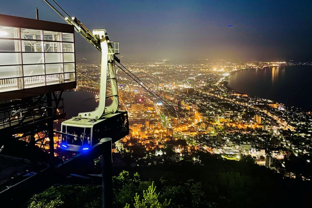山麓駅から山頂駅までは約3分の空中旅行。山頂展望台からくびれた地形が特徴的な夜景が楽しめるほか、夏の夜には津軽海峡に浮かぶイカ釣りの漁火が見えたり、冬の夜には元町方面で行われるイルミネーションでさらに灯りが増します。