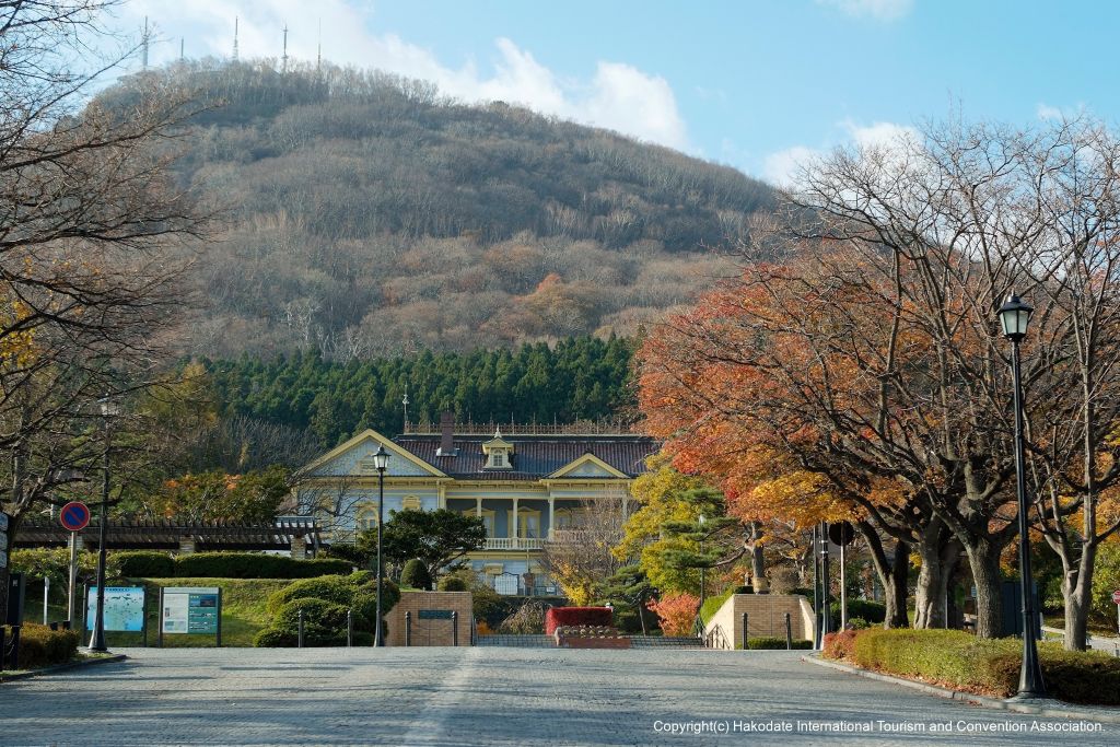 ベイエリアから徒歩15分程で「旧函館区公会堂」へ。基坂から進むと旧函館区公会堂と函館山の景観を見ることができます。