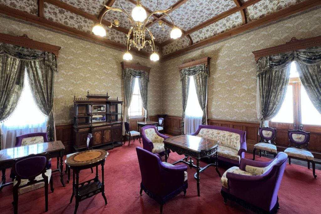 最後のポイント券1枚を使って旧函館区公会堂へ。函館で代表的な洋風建築の建物、国の重要文化財です。中に入って見学することができ、天気の良い日は2階のバルコニーから眼下の街並みを見渡すこともできます。当時の様子を示す素敵な内装や調度品も必見です。