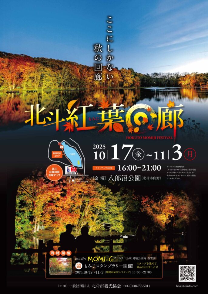 函館市のお隣、北斗市でも八郎沼公園で紅葉ライトアップイベントの「北斗紅葉回廊」が開催され、両会場をまわる「もみじスタンプラリー」も行われます。詳細は北斗市観光協会公式ウェブサイトをご確認ください。