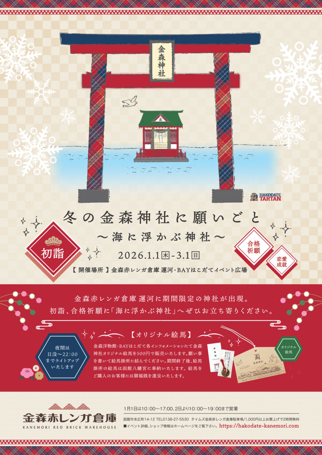 期間限定で登場する海に浮かぶ神社。函館山のふもとにある函館八幡宮の分社として建立されます。オリジナル絵馬販売やお守りの販売も。初詣や合格祈願で立ち寄ってはいかがでしょうか。