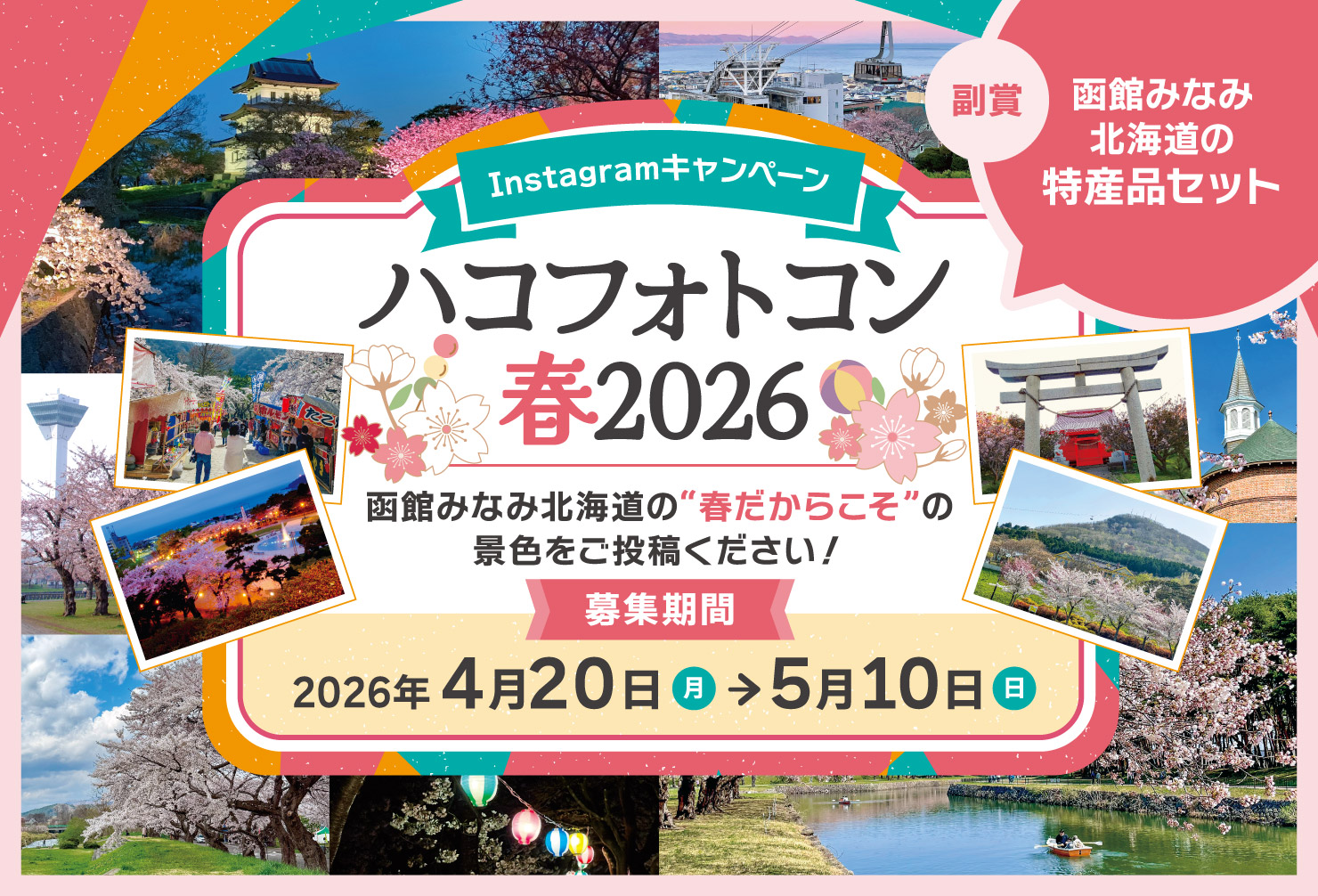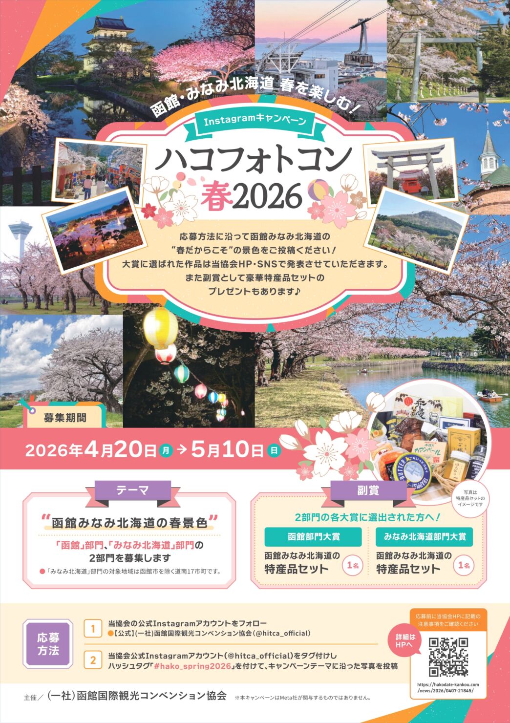 函館国際観光コンベンション協会では、2026年4月20日(月)から5月10日(日)にかけて春・桜景色の風景をテーマにInstagramを利用したフォトコンテストを開催します。フォトコンテストといっても写真の条件は「春だからこその景色が写っていること」のみですので、お気軽にご参加ください♪ご応募いただいた写真から選考を行い、函館の春景色とみなみ北海道の春景色の2部門で大賞を決定し、こちらの当協会ホームページで発表させていただきます。