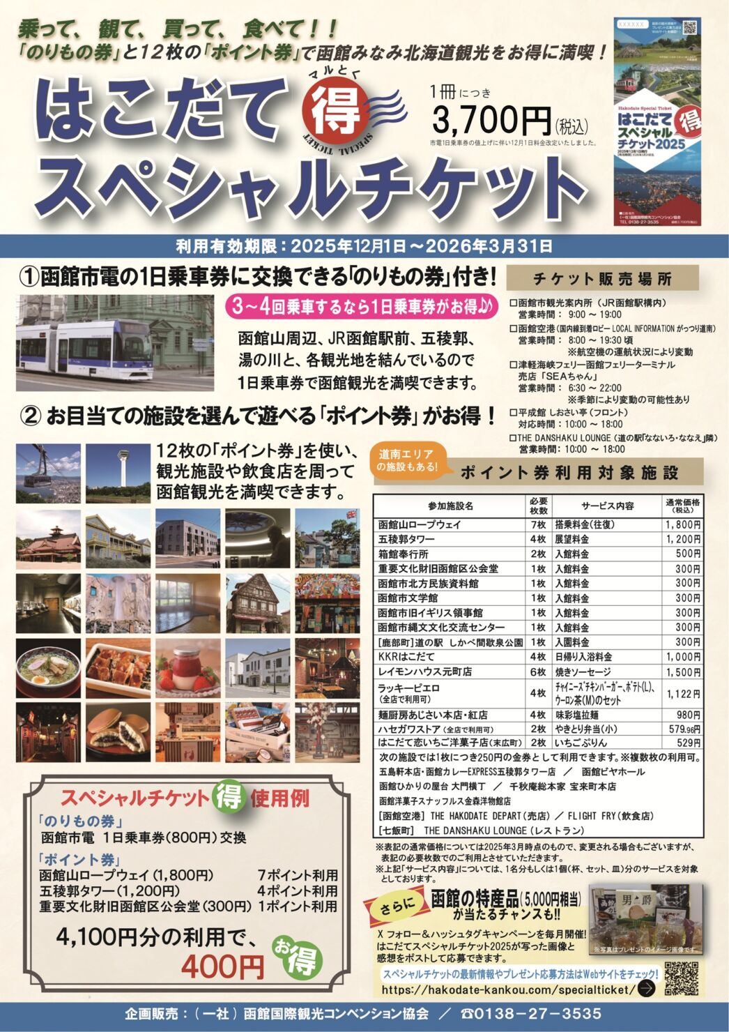 当協会では、2025年12月1日より、はこだてスペシャルチケット2025の販売価格 1冊3,500円を1冊3,700円に変更いたします。この変更は、ご購入のお客様が必ず利用をする「のりもの券」引換対象になっております市電1日乗車券(大人)が同日に1枚600円から1枚800円に変更されることを受けての対応となります。当チケットを適切に運営するうえで必要な対応となります為、ご理解いただきますようよろしくお願いいたします。