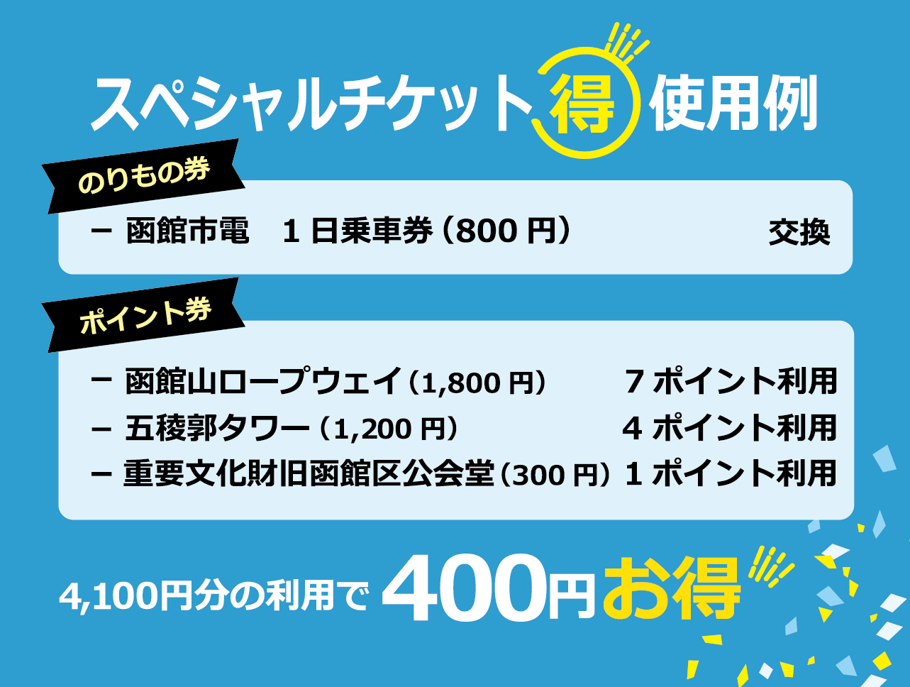 事前に予約購入しておくことで函館市観光案内所で「はこだてスペシャルチケット」と引換ができます。当日、購入する手間が省けて便利です。