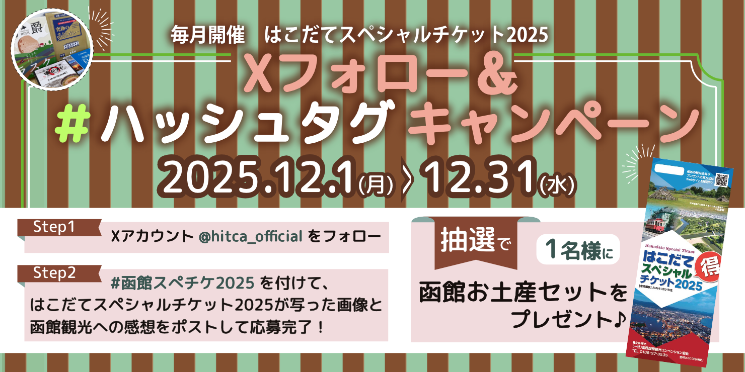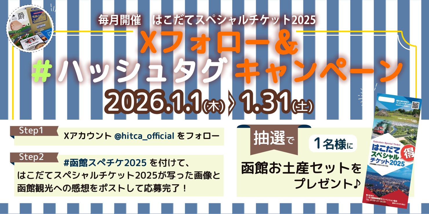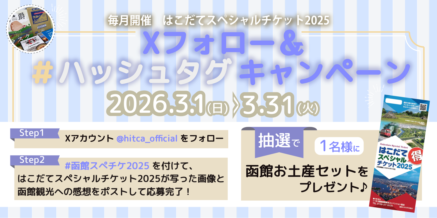はこだてスペシャルチケットの表紙等、チケットを購入したことがわかる写真と函館観光の感想などをXでポストしていただいた中から毎月1名様に5,000円相当の函館お土産セットが当たるキャンペーンを実施いたします!応募の際は必ずキャンペーン応募規約をご確認ください。