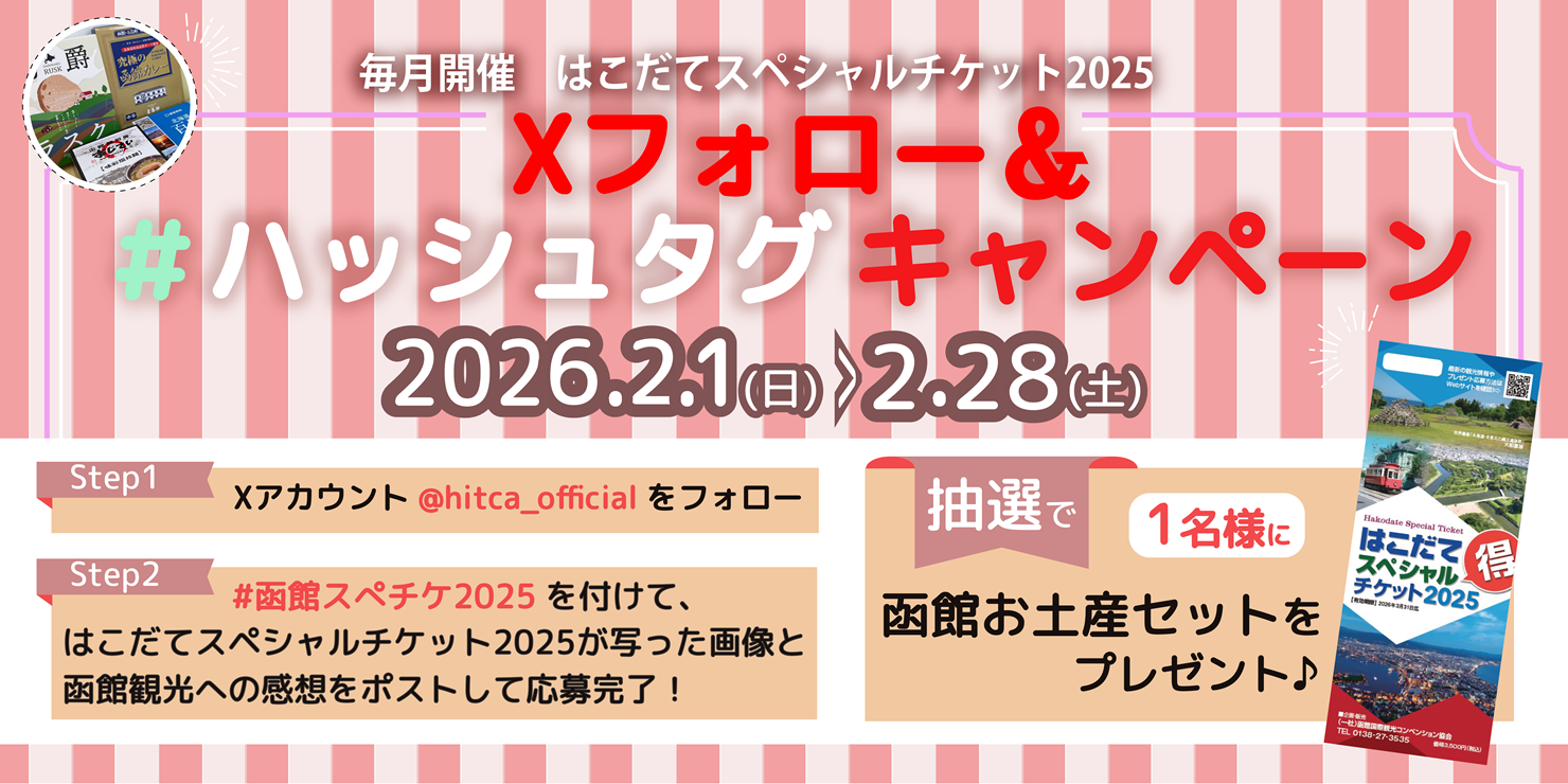 はこだてスペシャルチケットの表紙等、チケットを購入したことがわかる写真と函館観光の感想などをXでポストしていただいた中から毎月1名様に5,000円相当の函館お土産セットが当たるキャンペーンを実施いたします!応募の際は必ずキャンペーン応募規約をご確認ください。