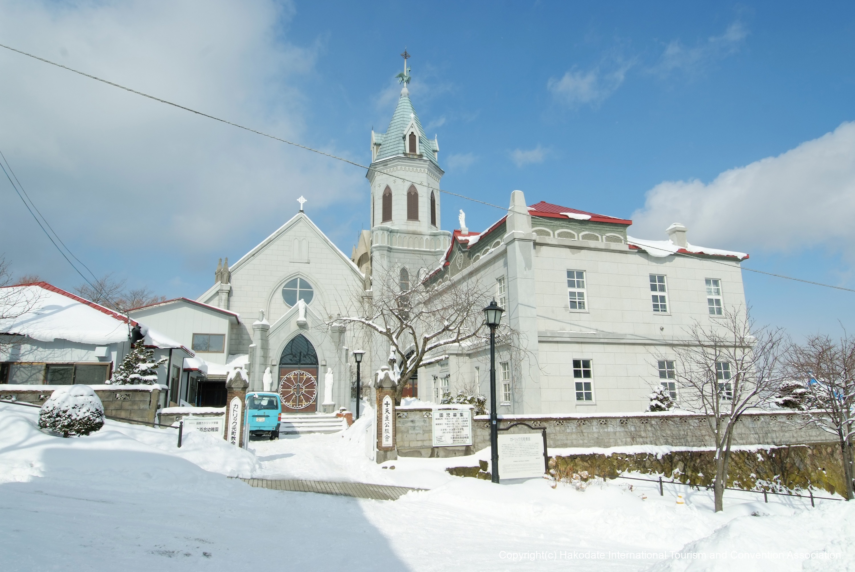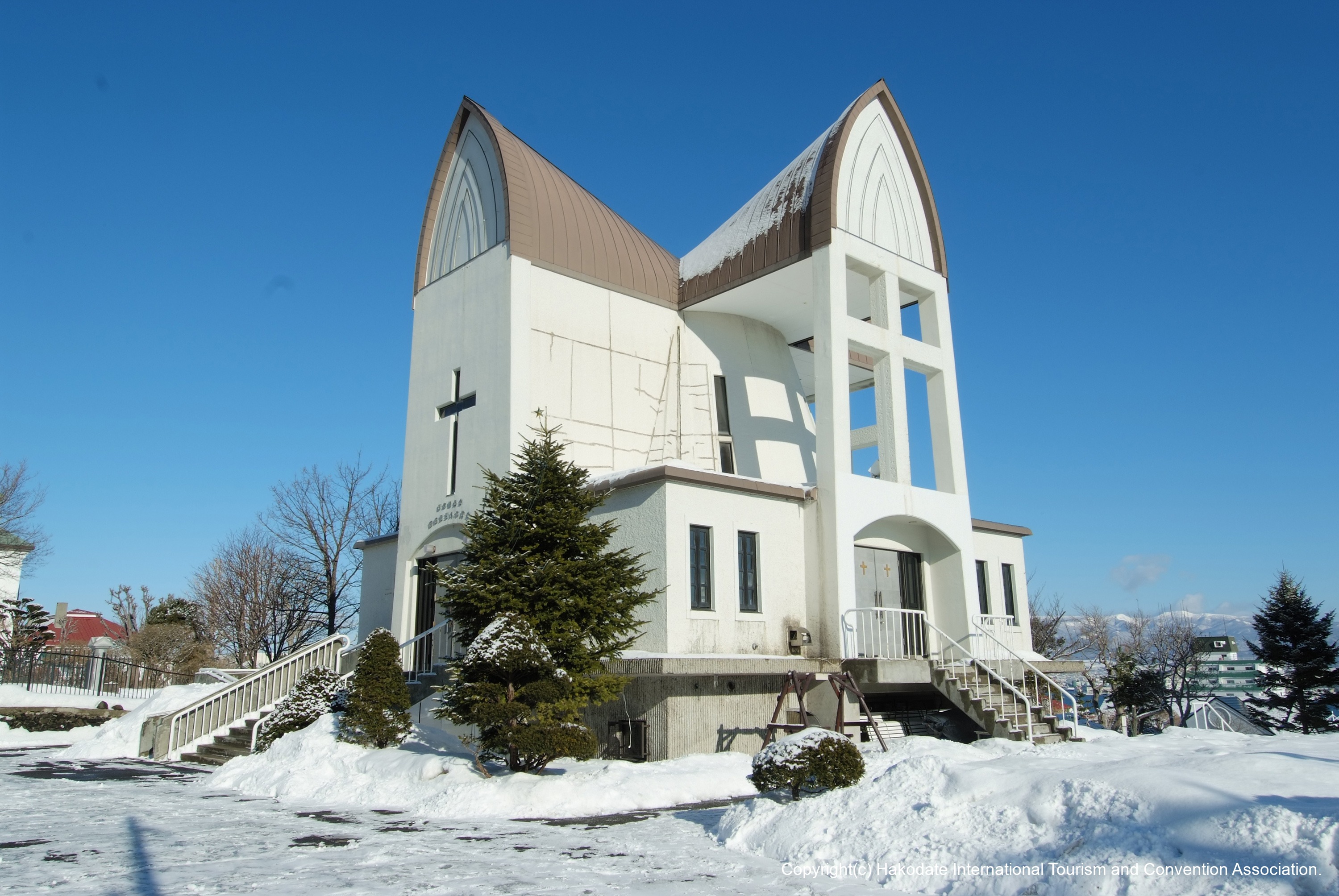 1874(明治7)年にイギリス人宣教師が道内最初の聖公会として活動を開始。現建築は1979(昭和54)年に建てられたもので、函館山や函館山ロープウェイから十字架の形をした特徴的な屋根を眺めることができます。