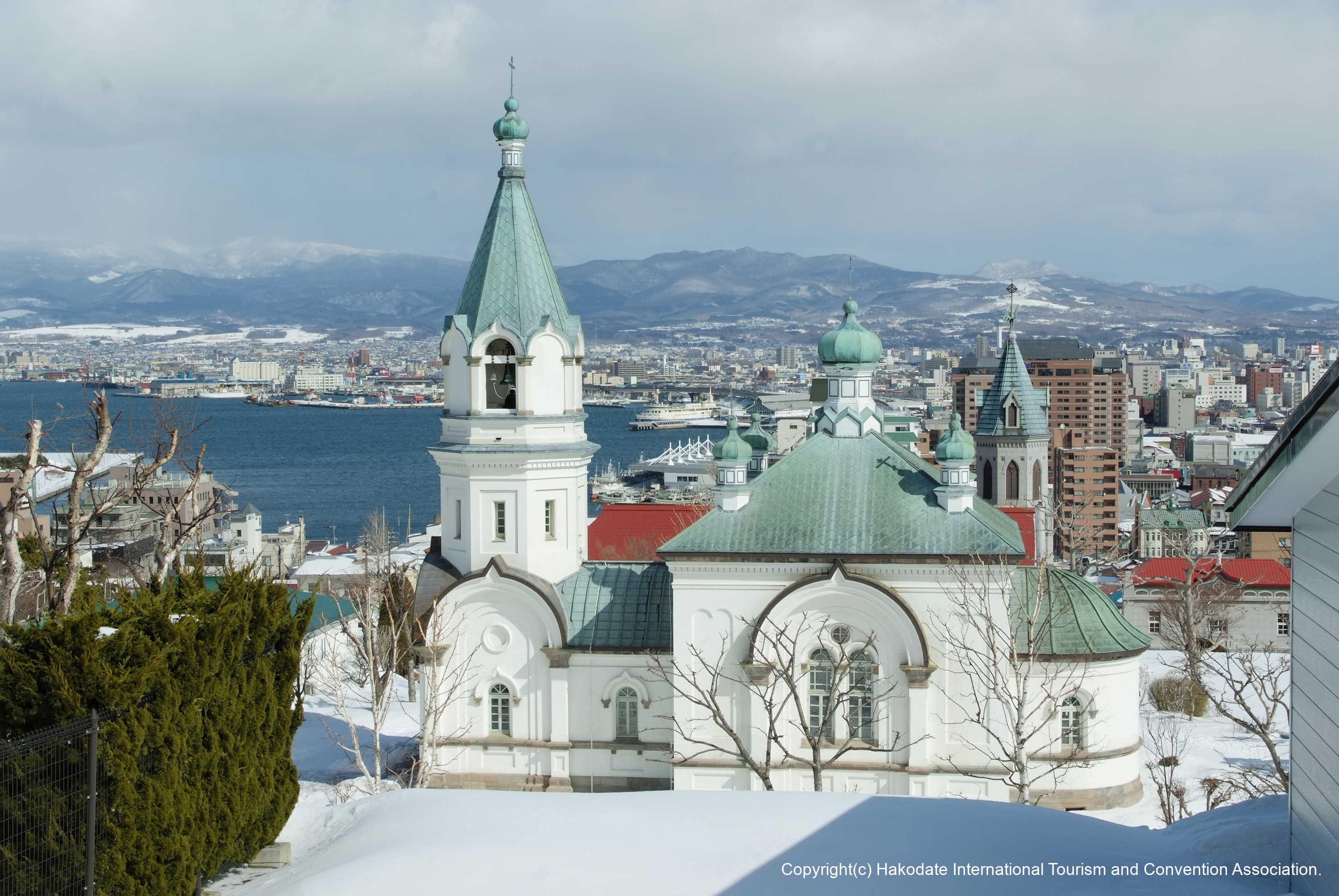 旧函館区公会堂から教会群へ向かう“港ヶ丘通り”と、秋には街路樹のナナカマド実が通りを真っ赤に染める「日本の道百選」にも選ばれている“大三坂”が交差する地点に、ロシア、フランス、イギリスの教会と日本の寺院が向かい合って並び、異国情緒を通り越し異世界感すら感じる不思議な世界を作り上げています。
